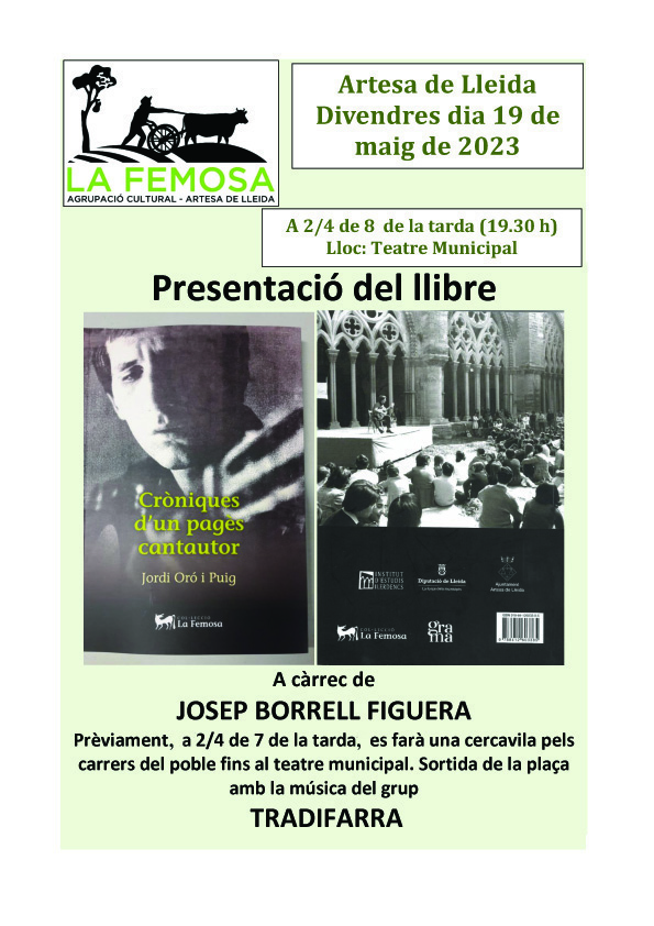 Presentació del llibre “Cròniques d’un pagès cantautor” de Jordi Oró Puig, a càrrec de Josep Borrell Figuera, a 2/4 de 8 al Teatre Municipal D’Artesa de Lleida.