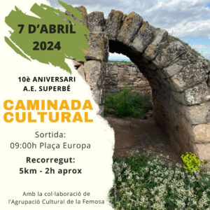 Caminada Cultural organitzada per A: E. Superbé, amb la col·laboració de l’Agrupació Cultural la Femosa, per la zona sud del secà d’Artesa de Lleida. Amb un recorregut d’un 5 Km (2h aproximadament) amb visita comentada a diversos elements etnològics del nostre terme.