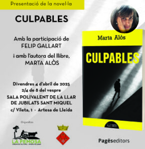 Publicat a 01/04/2025Presentació de la novel·la: Culpables A càrrec de Marta Alòs, autora i la participació de Felip Gallart. Divendres 4 d’abril març de 2025 a 274 de 8 del vespre Sala polivalent de la Llar de Jubilats de Sant Miquel (carrer Vileta, 1)