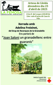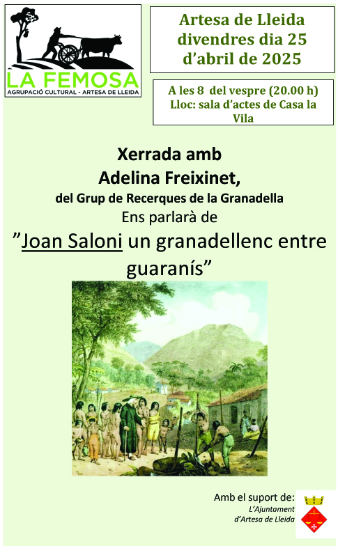 Publicat a 24/04/2025Xerrada: Joan Saloni un granadellenc entre guaranís, a càrrec d’Adelina Freixenet. Divendres 25 d’abril de 2025, la Sala d’Actes de Casa de la Vila a les 8 del vespre.