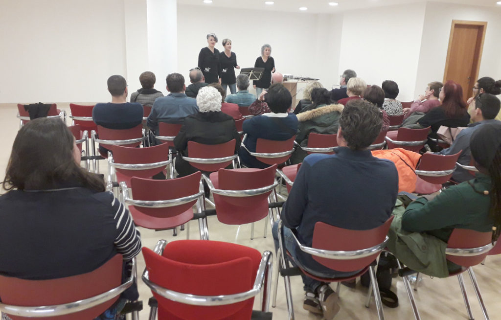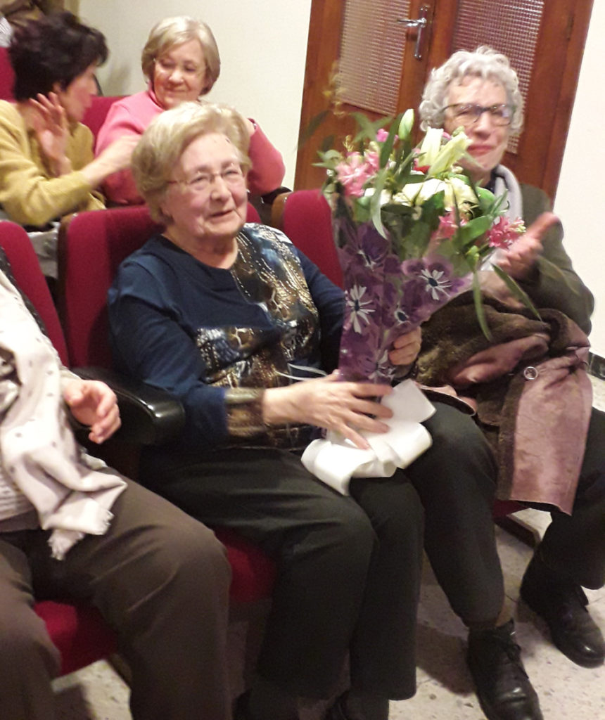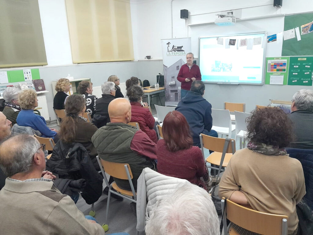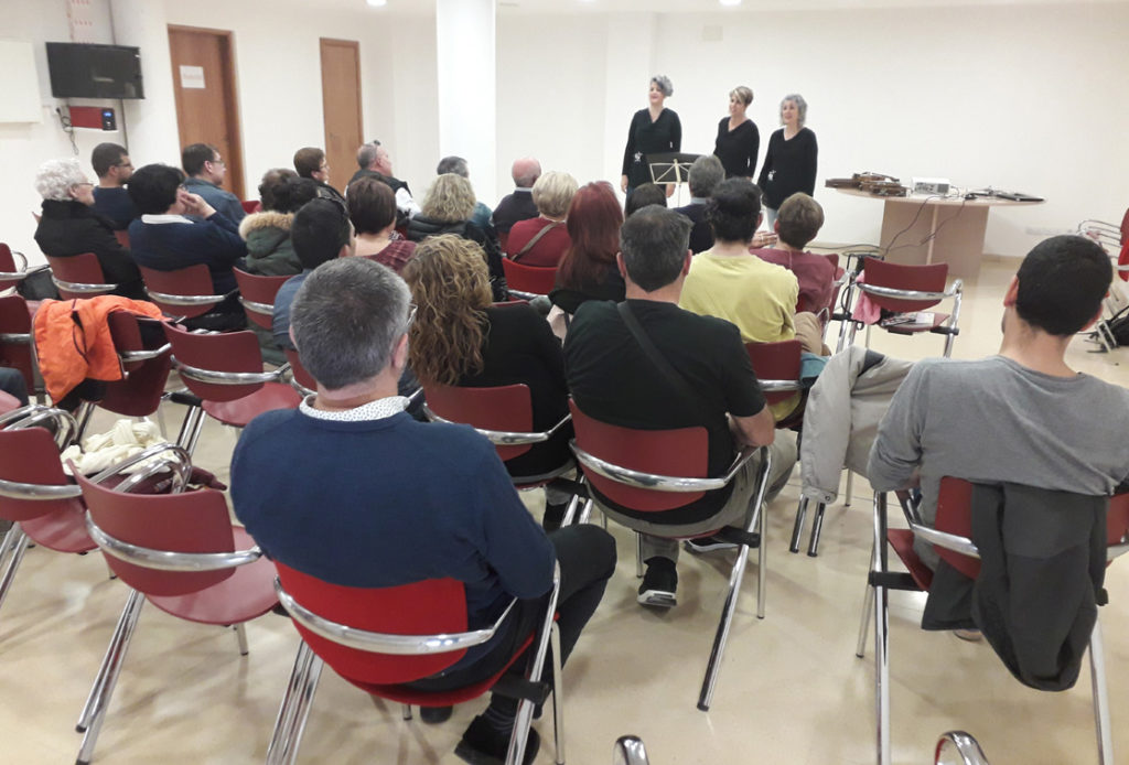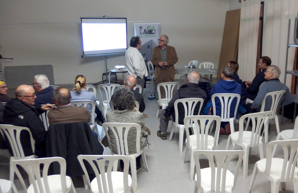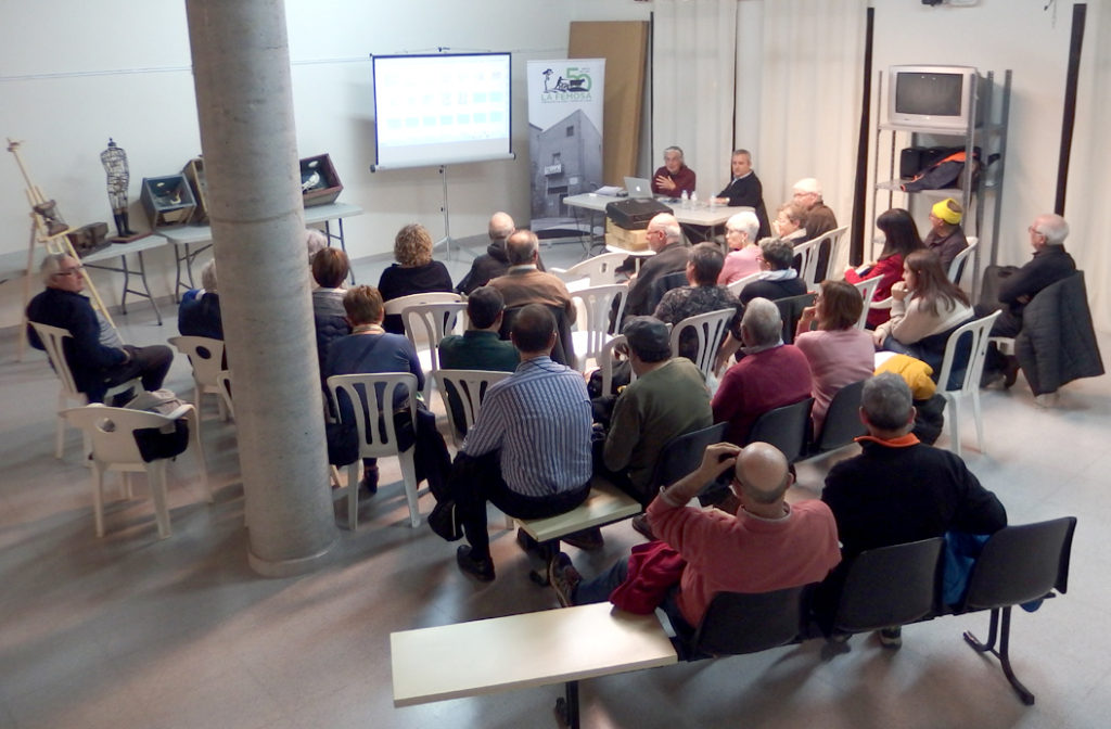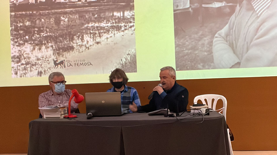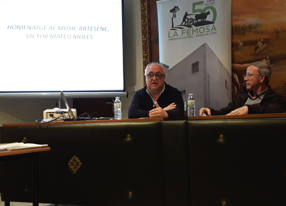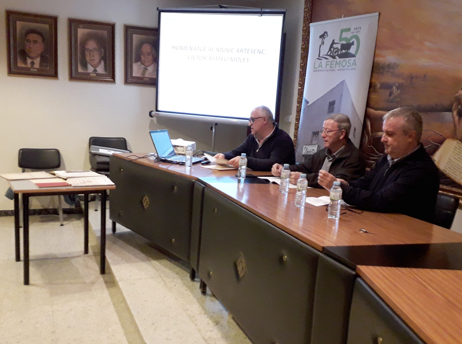 Imatges de la xerrada “Homenatge al músic artesenc Víctor Mateu Moles”, a càrrec de Lluís Marc Herrera i Llop i Dionís Gutiérrez i Rosich, presentats per Felip Gallart, que va tenir lloc el 6 de març de 2020. Va assistir a la conferència la senyora Carme Estrela Sanou, viuda de Víctor Mateu, a qui l’Agrupació Cultural la Femosa li va lliurar un ram de flors.