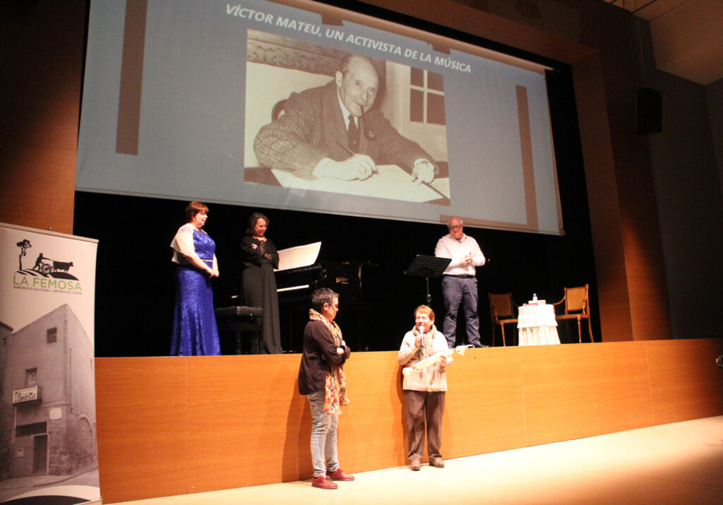 - Imatges de la Conferència-concert sobre el gran compositor artesenc Víctor Mateu Moles (Artesa de Lleida 1898 – Lleida 1987) “Víctor Mateu, un activista de la música”. A càrrec de: Montserrat Raimat, soprano; Marta Mesalles, piano i Lluís Marc Herrera (conferenciant), catedràtic d’Educació Secundària i doctor en Geografia i Història. Celebrada el 25 de novembre de 2023 A les 8 del vespre al Teatre Municipal d’Artesa de Lleida.