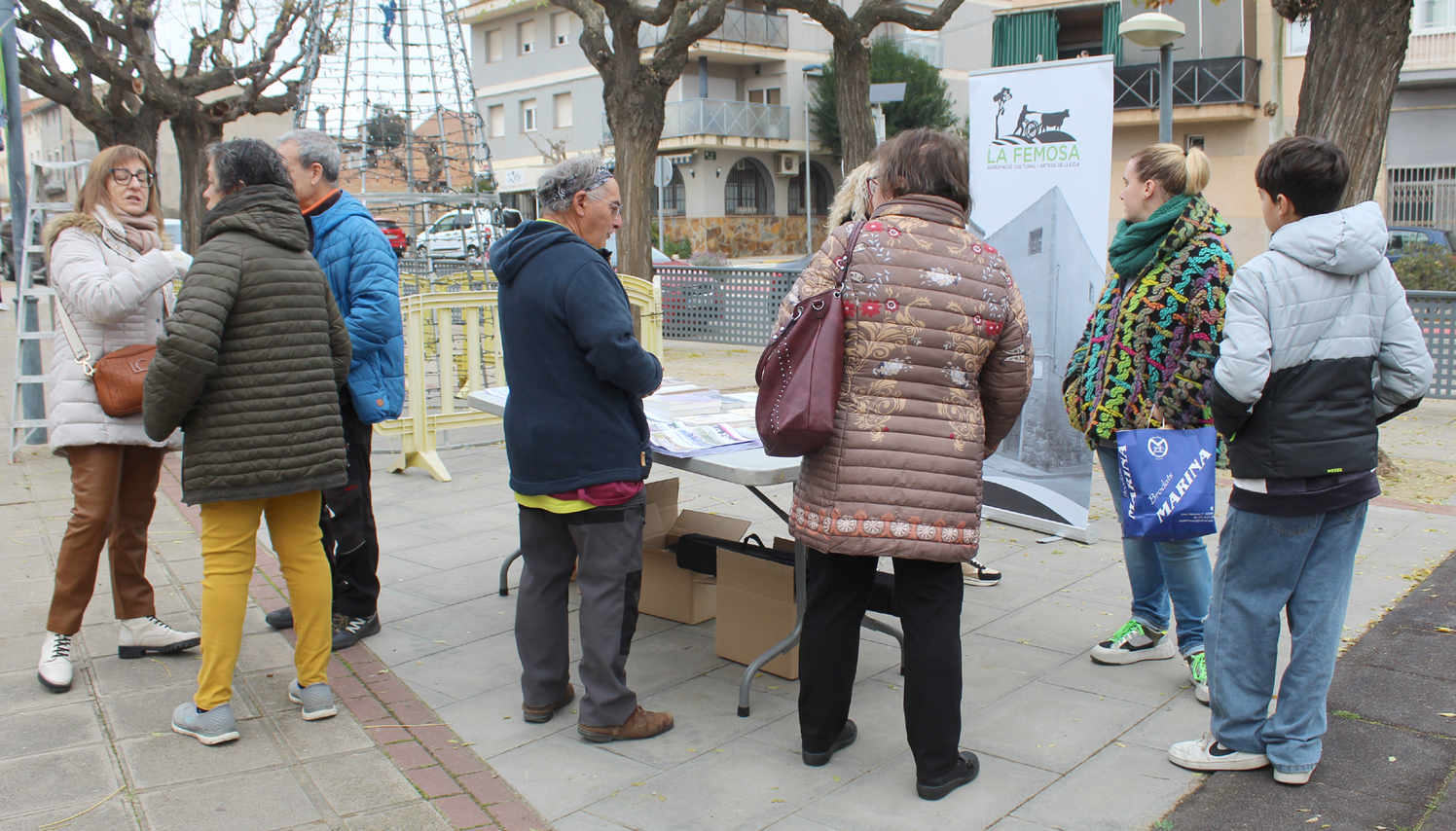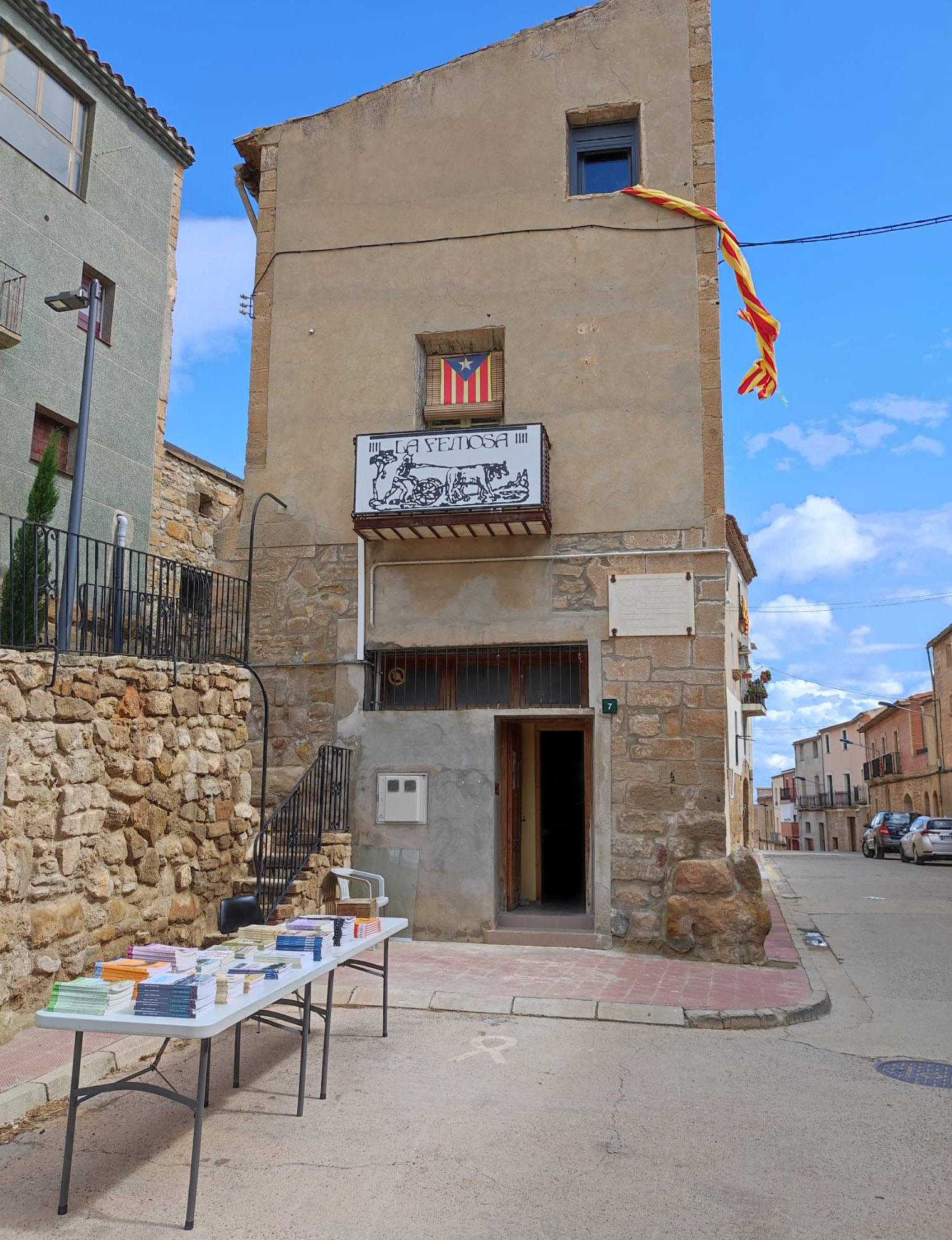 Imatge de la “Parada de llibres editats per l’Agrupació Cultural La Femosa” amb motiu de la Diada de Sant Jordi, davant la seu social de La Femosa.